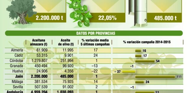 Jaén volverá a ser la “tierra del aceite”, ya que no existe provincia alguna que iguale sus parámetros. No obstante, la producción que se espera no destaca ni por arriba, ni por abajo. Si se compara con las cosechas de los últimos cinco años, crece el 1%, algo que deja claro que será una cantidad de zumo de la aceituna bastante normal para esta tierra. No obstante, si se compara con el “mazazo” del año anterior, supone un incremento del 111%. Asimismo, este repunte conlleva un auge del producto del que dispondrá Andalucía. De hecho, el peso que tiene Jaén en el aceite hace que la comunidad se comporte de una manera bastante similar. Las ocho provincias sumarán 1.030.093 toneladas, lo que implica una subida del 1% respecto a los últimos cinco años y del 53%, si se compara con la campaña anterior.